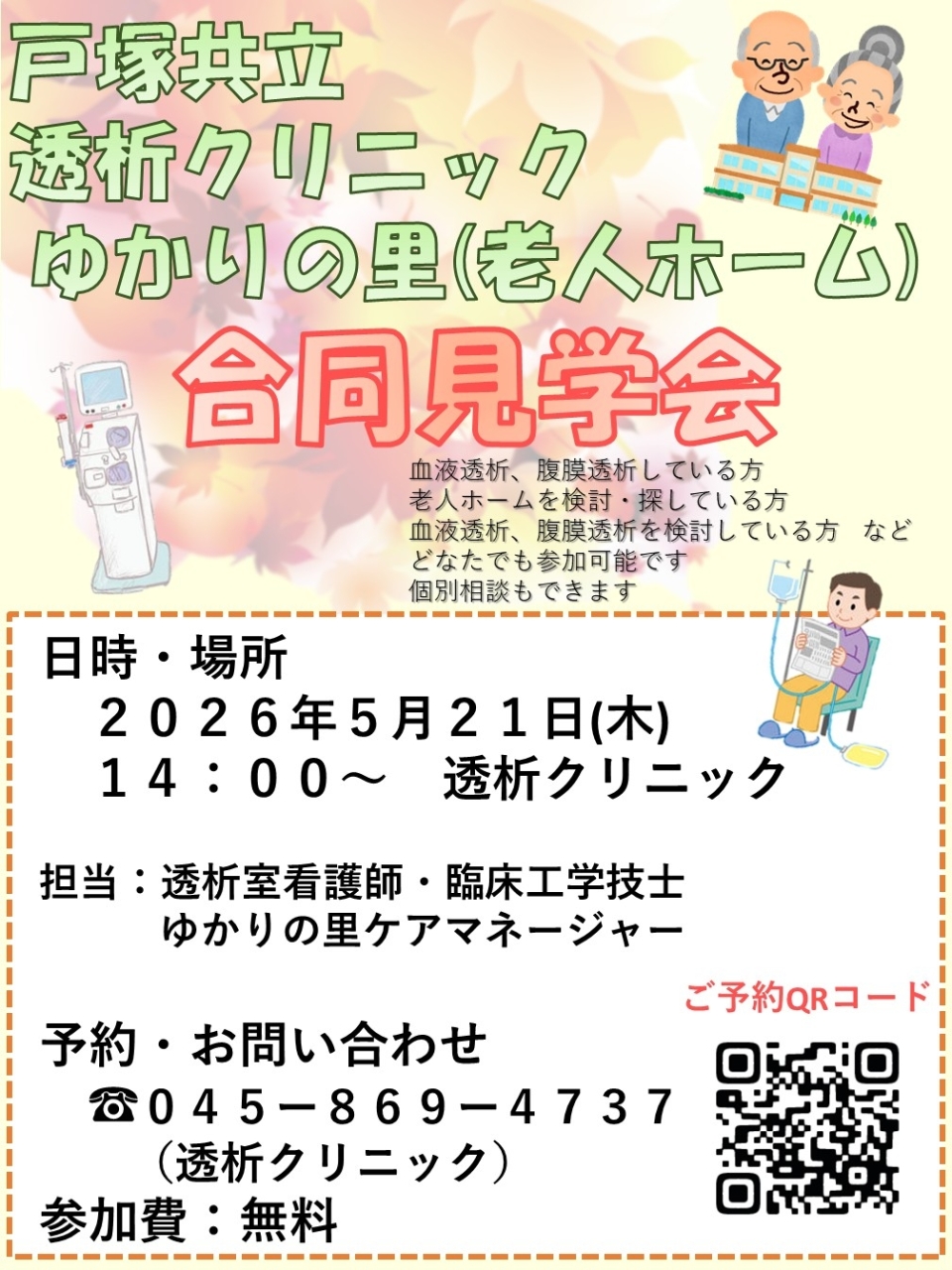 合同見学会のご案内 2026.04.27 戸塚共立透析クリニックと戸塚共立ゆかりの里(老人ホーム)の合同見学会を開催します。 日 時:2026年5月21日(木)14時~ 会 場:戸塚共立透析クリニック 参加費:無料 担当者:透析室看護師・臨床工学技士・ゆかりの里ケアマネージャー ゆかりの里・透析クリニックの施設内見学を予定しています。 個別に相談等も可能です。 時間は14時より1~2時間程になります。 ※感染症の蔓延等により見学が制限される場合もあります ご予約はポスターのQRコードから、または下記までお電話ください 予約・お問い合わせ:透析クリニック<045-869-4737>